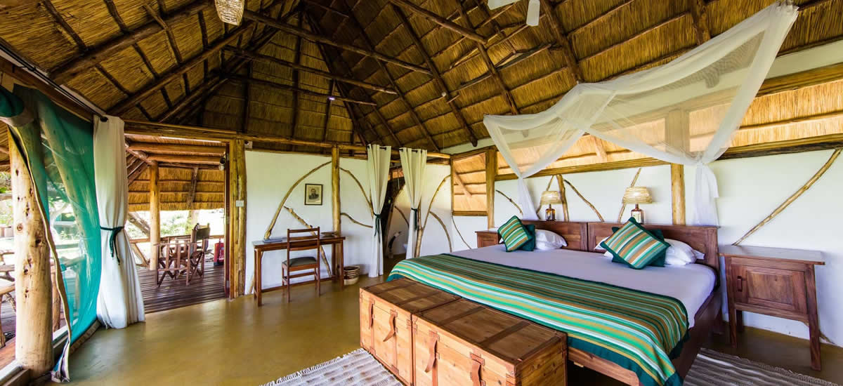 With a thatched central lounge, dining and bar area, and a refreshing swimming pool, the eco-friendly lodge offers an ‘Africa of olde’ feel. Built on raised wooden decks to take full advantage of cool breezes and spectacular river views, each spacious thatched cottage includes a fan, room safe, and beautifully appointed bathrooms with solar-heated showers and some also featuring baths.